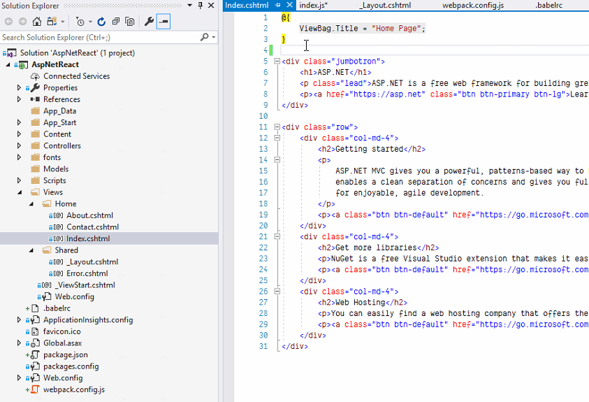 Let's add an entry point for React in Views\Home\Index.cshtml file by deleting everything except ViewBag.Title section and add <div id="app"></div>.