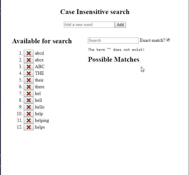 I've created this initially for academic purposes to learn Trie data structure so Trie class is imperative and useTrie hook was forced to fit to work with declarative nature of React as shown below, which is not ideal.