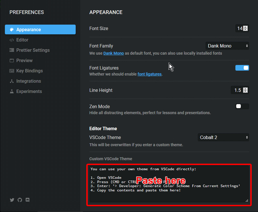 And now paste the VS Code Color Theme copied from the previous step in the Custom VSCode Theme text area. You can now see that the theme has been updated globally.