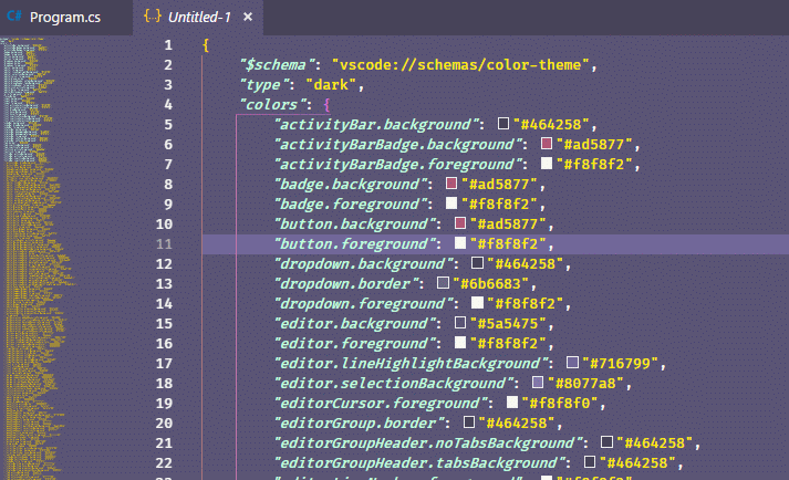 After executing the command, you will see a new tab, Untitled-1 popping up with Color Theme in JSON format.