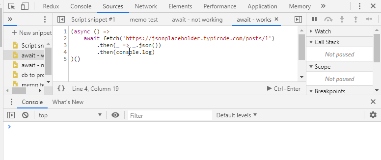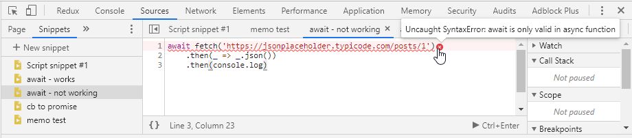 Within an editor (I am using a Snippets feature, which is like a scratchpad but works like an editor. You can try it in your favorite editor like, VS Code, Atom, or VIM), await does not work as it needs to be called within an async method.